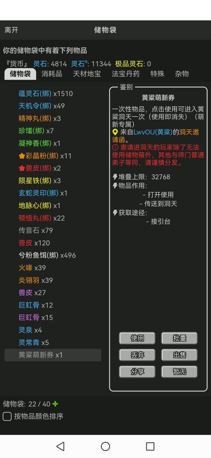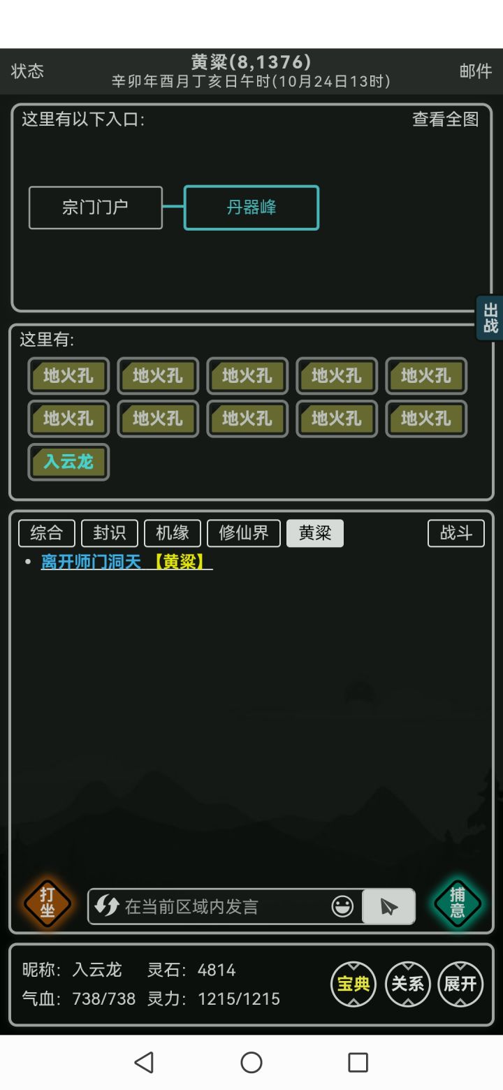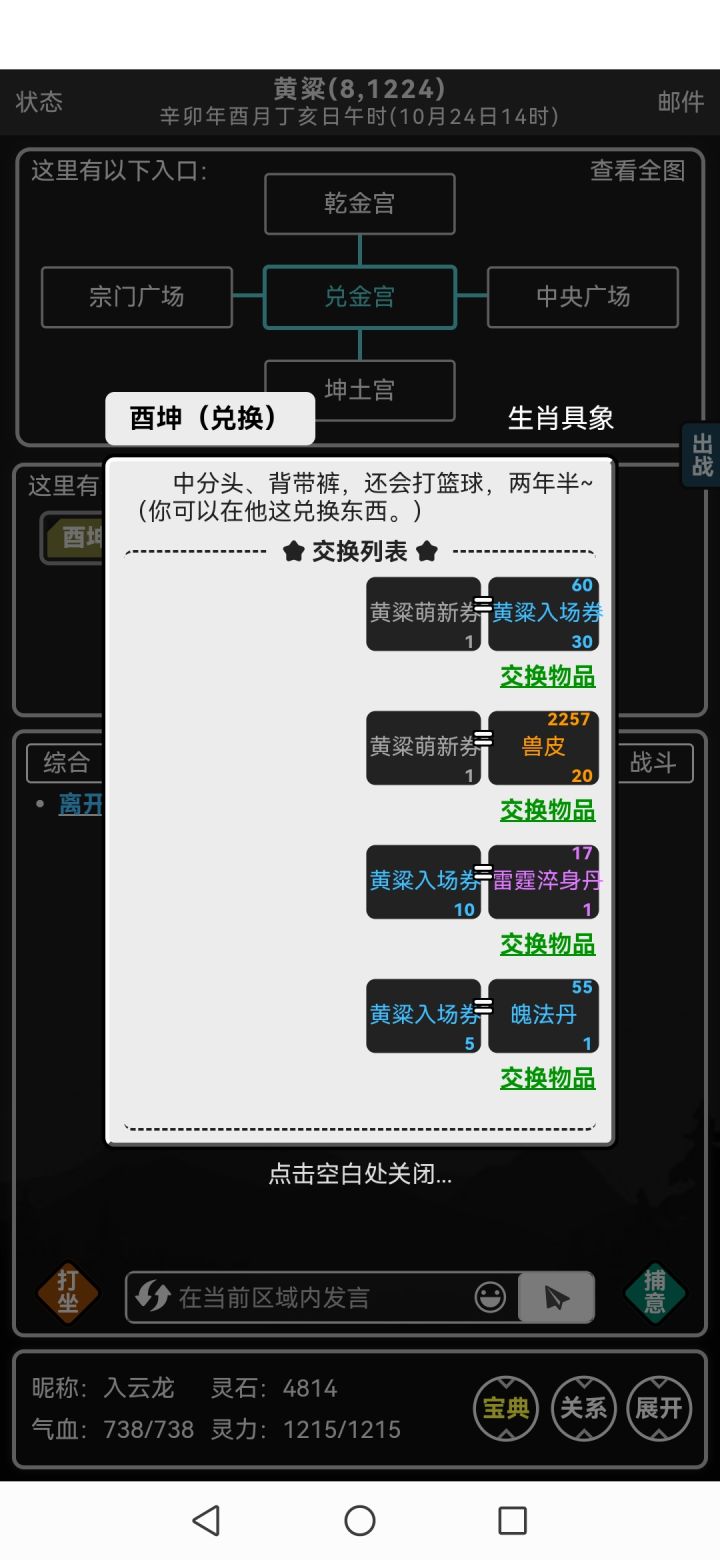 右下角展开有个坊市,点击进入坊市,点传送阵离开坊市。 坊市门口或左上角有摊子,大概率会在左上角,门口一天要1440灵石摊位,而左上角虽然偏僻,但一天只要144*3=432灵石。故我喜欢摆左上角(ಡωಡ) 摊位有一灵石一张的萌新劵,可以进黄粱洞天耍耍,黄粱洞天酉坤那可以每天一灵石一张的萌新劵换20橙皮(每天) 黄粱洞天右上角练功台有个练功人偶,可以边打坐边打人偶练技能。 洞天宗门入口右边丹器