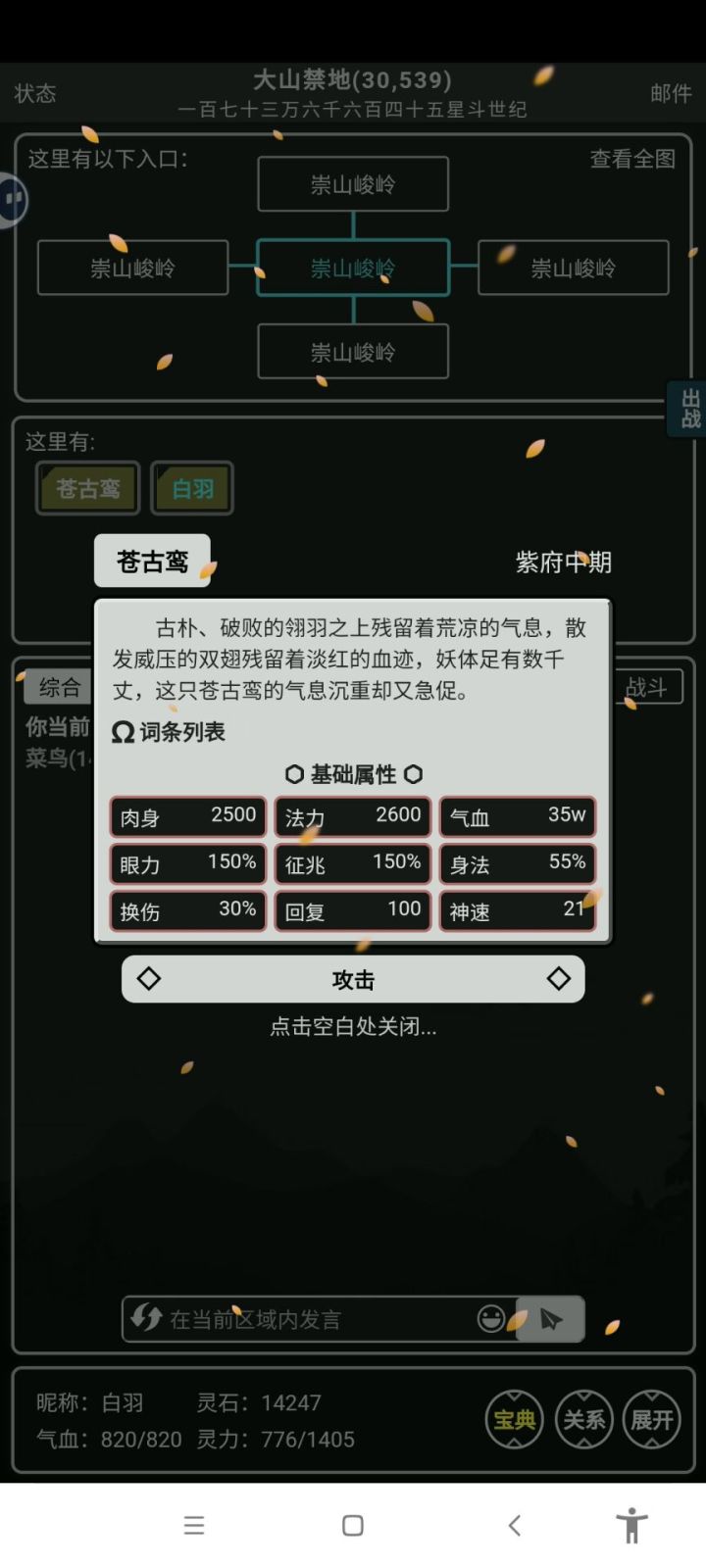前期的主要目的就是赚取灵石提升修为,为了更好的赚取灵石和增强战斗力,必须得养一只宠物,目前前期最通用的宠物便是雪山的寒冰猛犸,简称大象,你可以委托群中的老祖们,长老真人们,帮你抓取,一般来说3000~4000灵石左右的大象就够你用了过完主线任务之后记得到玄天宗安神峰购置一处洞府,任务到你前往陆巡师兄住处之后让你练气期再回来,这时候我们的前期主线任务完成了,你就可以自由游玩了前期去地图上的“野外