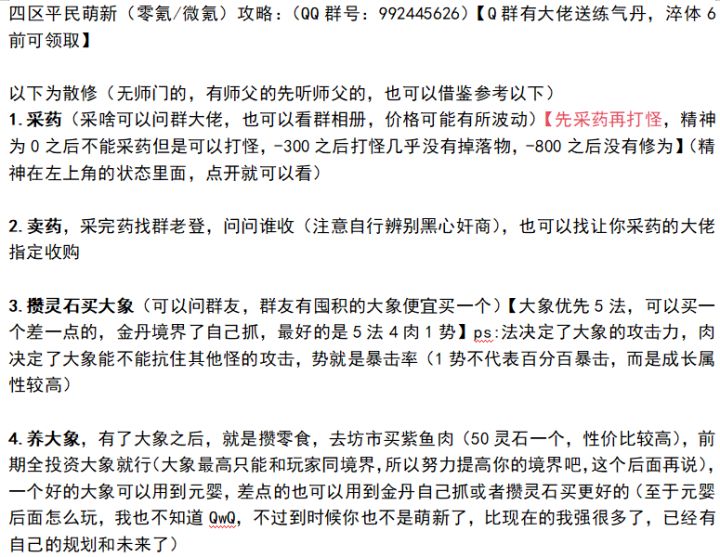 首先一区,这个区宗门林立,老登众多,萌新去这个区的话能找老登领到起步资源,缺点是一区抢怪情况特别严重,三天吵两架那种,且物价昂贵。然后说到二区,二区没有宗门,老登也坐化得差不多了,找到师傅的话也能爆师傅金币,是很好的起步,人数少,资源多,意味着不用和一堆人还有脚本抢草药抢怪,物价也相对较低三区和二区的情况差不多,也是没什么人,就直接略过最后当然就是四区,可能新人会想着去四区当大佬跟进度,但是