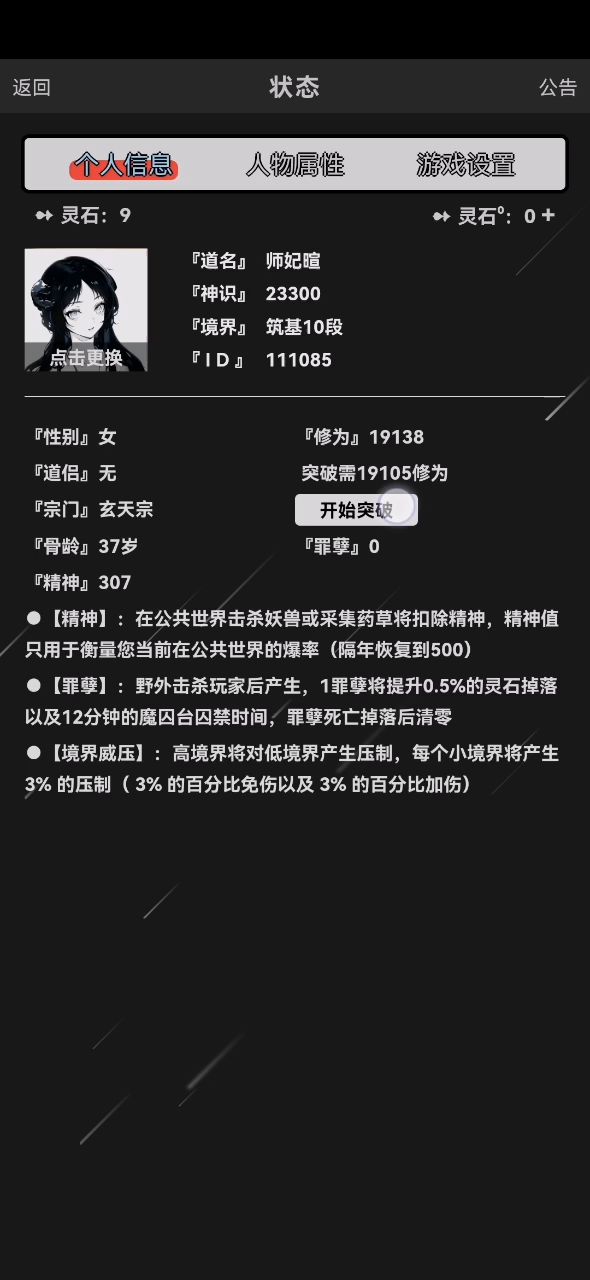 以下内容只是个人心得(道友看看就好) 道友进入游戏会先进入新手指引(我这里直接跳过新手任务,有新手引导我相信道友基本都没有问题的)过完新手主线后,就自己探索了,此刻的道友们我相信非常懵逼(我是谁?我在哪?我该做什么?)道友们别傻傻的出去打怪了,本游戏在没有任何装备的情况下,连只鸡🐔,你也打不过。1:先把邮箱的物品领取后,获得100灵石后就去宗门灵矿山,先挖矿挖矿选择10灵