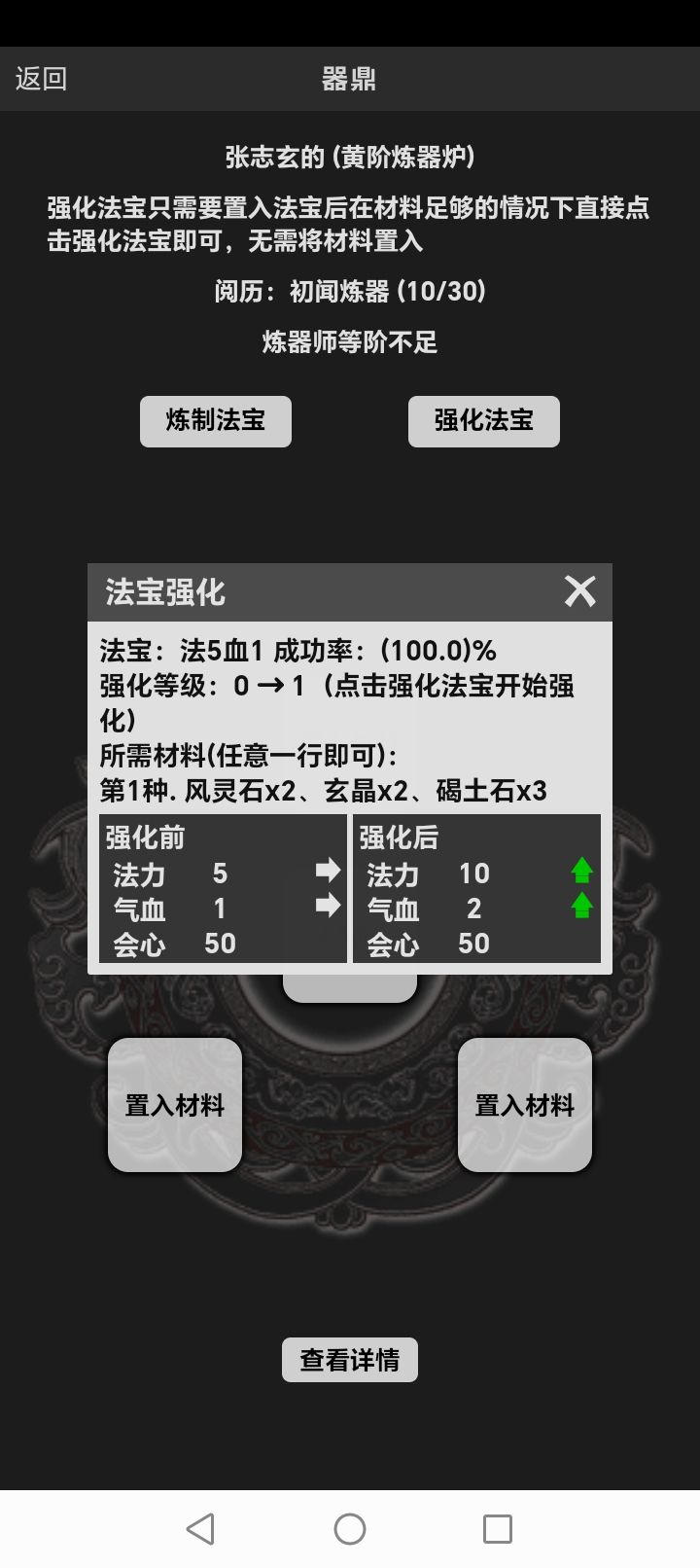 强化装备遇到一个问题。风灵石什么的储物袋里有。图二; 为什么强化不了。提示:强化材料背包里没有。大佬相救