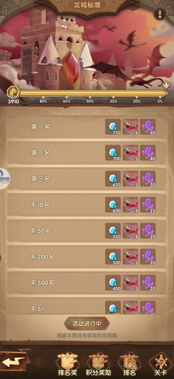 明天就要结束了。所以今天抽空打完。结果这龙城秘境排名奖励不划分了?。上次龙城宝藏起码还可以看到划分的排名奖励。这次???我id是一曲风华