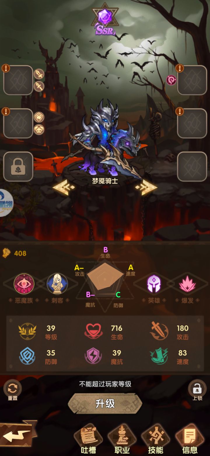 各位大佬好!今天给大家分享一下我通关过程里帮我抗住N多伤害的白骨骑士先给大家讲下白骑的技能尸骸体质:回复50%/100%/150%攻击力的血量和清楚负面状态 ssr恢复最大生命值15%的血量 er提高50%魔抗这个技能保证了白骑只要不被秒掉就可以很快恢复到满状态继续扛下去 也是他成为滚刀肉的基础 本身使用的是战戟(所有同级别武器里攻击最高的)完美契合被动 后期成长起来只要还有个血皮就能回满