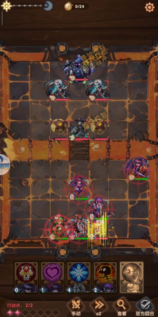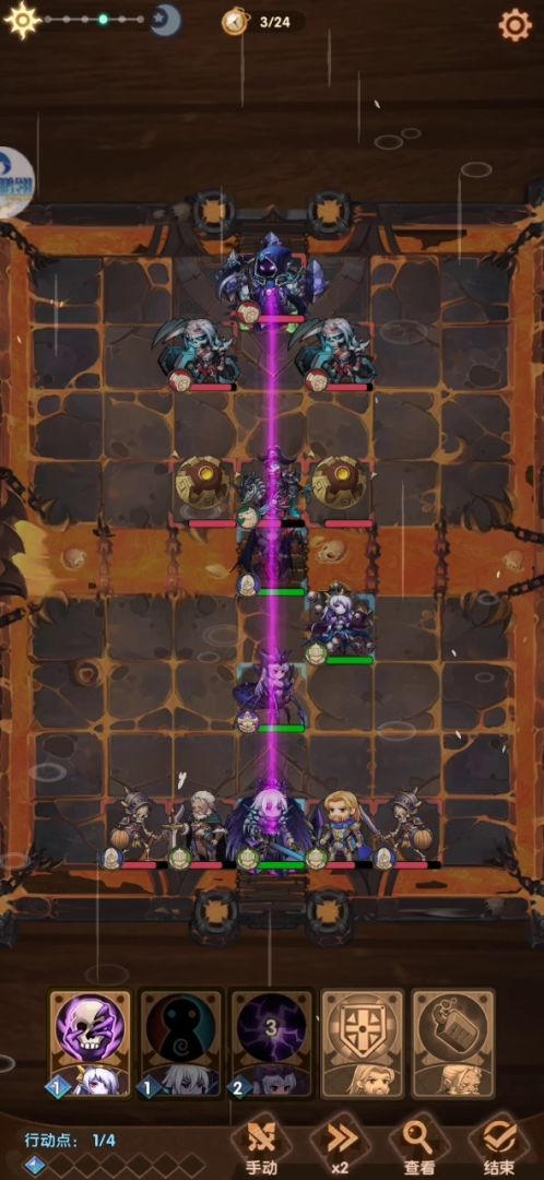关卡特性:骷髅召唤流典型关卡,boss骷髅炮和骷髅骑士,两个精神控制,每回合两个骷髅下攻,两个冰球攻略:两个精神控制,所以要两个0级小弟随便找,配个战士buff就好,两小弟站位如图,这样召唤的骷髅不会打皇后,这里耍了小聪明O(∩_∩)O1.根据自己战力情况选择打骷髅骑士血限,然后让公主夺舍,蜘蛛下完蛋减防完就可以给了无所谓,骷髅骑士和召唤的两个骷髅配合攻击输出很高,可以快速打压boss炮的血限