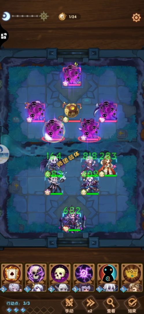 当时没有截图,这个是后面的关。当时的站位和上的人就是截图是这样的,思路是女神换血优先强杀死灵,不让继续招骷髅,然后清其他炮手和骷髅,骑士最后再打。1. 城堡左右两边站让对方控制的人,稍微挡一挡骷髅,多苟一点是一点。2. 女神在开局第一回合向上走,换骷髅骑士的血。但是不要集火骑士,他死了会出2骷髅还会复活。3. 之后回合女神继续向上直到能换血死灵,换血秒掉。这中间要看点人品,如果女神被冰了