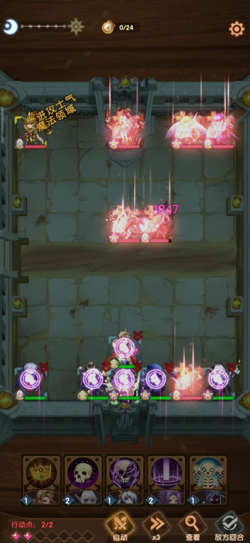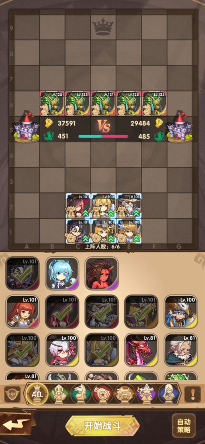 不知是否恶魔用习惯了,觉得恶魔挺好用的,特别是六职业恶魔:皇子,骑;魅魔,车;红龙,炮;黑龙,法;皇后,战;死神,刺。这套阵容,前十回合核心是魅魔,十回合后是皇子。魅魔突重围,黑龙控血线,死神清残血,红龙上状态,皇后回生命,皇子收残局。操作很简单,皇子引爆不要行动点,开局多SL找到好引爆点,之后魅魔大开杀戒即可。缺点就是如果魅魔挺不过三回合就要重开了。本人23章之前用三刺三法,在23卡了