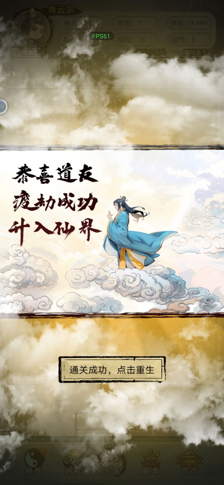 1.第一次轮回,很累很累,因为需要看很多广告,广告和游戏时间大概10:1,没错,看广告个多小时,十分钟通过,由于第一把不熟悉,看了80个广告,按着tap广告规则,大约为作者赚24块钱👀2.人生没有捷径,但是你可以有“遮天瓶”,第一把一定要想办法从河神那搞到这玩意,有此宝物,无论何种途径得到的丹药全部翻倍,包括广告得到的,有多重要,得到后自行体会3.灵替符,用来替死,如果想放飞自我随便点,那此物