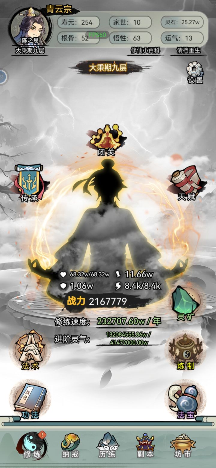 1.开局7点世家(前中期可以白嫖家族物质,用不上的还能卖钱),剩下平均分配即可,天赋尽量选加悟性运气的,悟性高了破阶不用吃药,悟性不够用寿元炼丹,前期千万别浪费钱买破阶丹。2.选项奖励的真气丹通通卖掉,买属性丹药,前期钱少就优先悟性-根骨-运气-属性,后期不缺钱了全买,无脑氪药。特别是采集任务后面给的一气丹一个1200w。3.功法拿到第一本地级就可以开始连续融合了,融到100封顶,后面天级也是
