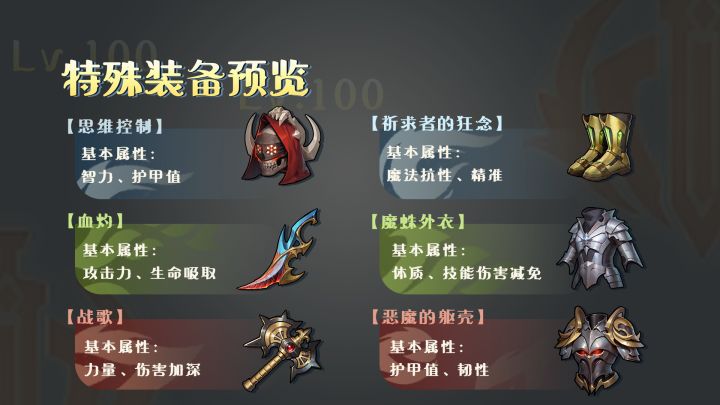 亲爱的冒险者,本周爆料,拉拉姆幸不辱使命带到。特殊装备一直以来都是搭配的变数,前有“夜行者”刚上线时,狂战士和游侠带着“夜行者”在竞技场大杀四方;后有“破冰巨刃”成为绝佳熔炉胚子,助圣教军坚不可催。这次的特殊装备会带来什么变数呢?〓 特殊装备属性 〓这次共计上线6件特殊装备,一般来说6件中会有1件在“亵渎之地”的BOSS地图掉落,其他的只能在试炼之塔碰运气,具体的掉落途径,拉拉姆会在最后的