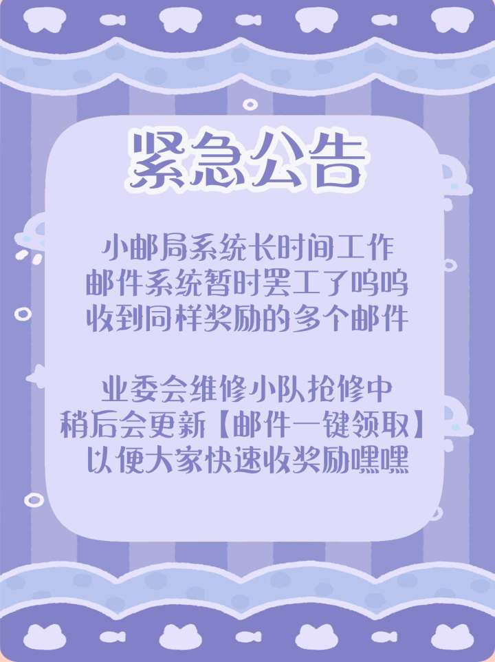 哈喽小主理们~今日迎来了开测星光祭版本也上线啦~为了庆祝这大喜日子星光镇小邮局忙得不可开交邮件系统也暂时罢工了许多小主理可能会收到多封同样奖励的邮件为此业委会深感抱歉~目前已经在抢修中!!稍后会更新【邮件一键领取】功能以便大家快速收奖励嘿嘿希望大家能在星光镇玩得开心(手动送花!最后最后~欢迎大家加入花花与幕间剧后援团,更轻松愉悦地建造百年剧团!QQ群:#游戏种草计划#花花与幕间剧