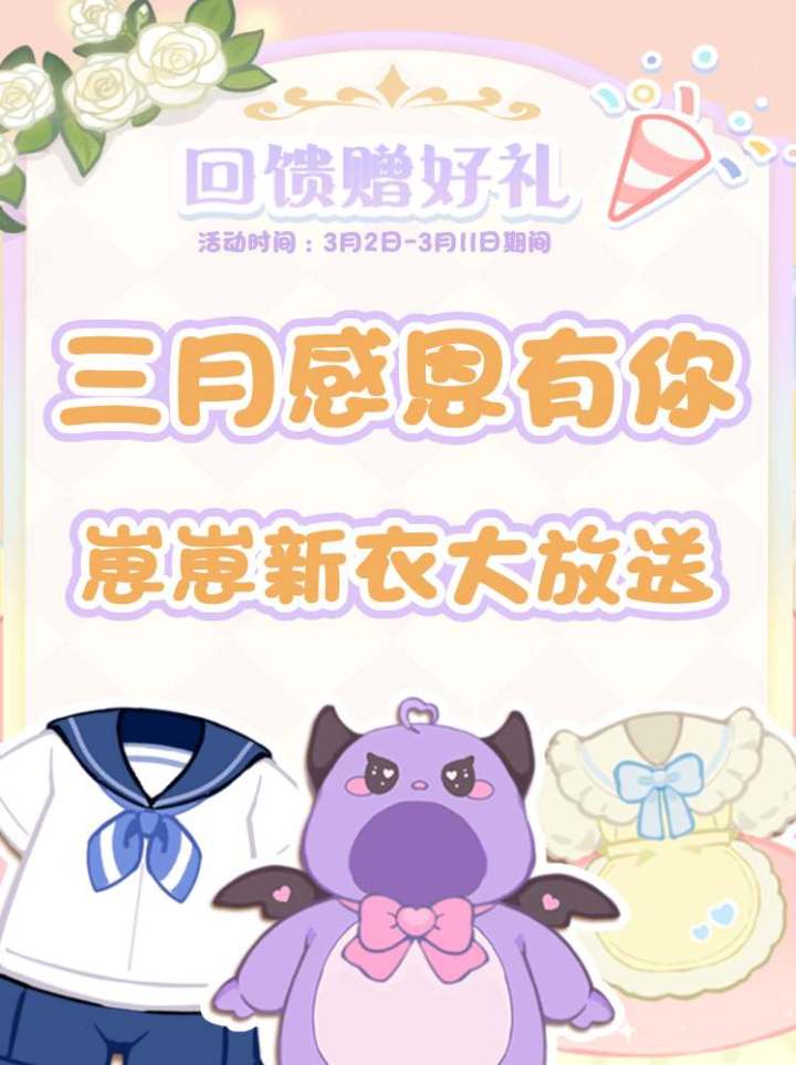 叮咚~叮咚~为了感谢主理们一直以来的支持星光镇3月回馈送好礼活动开始啦~在3月2日——3月11日期间崽崽出门达到累计次数(3次、6次、10次)即可分别获得3个崽崽的新服装~快来给你的崽崽穿上靓靓新衣吧!!~#浅评一下#花花与幕间剧#游戏安利#游戏讨论#游戏福利#游戏资讯