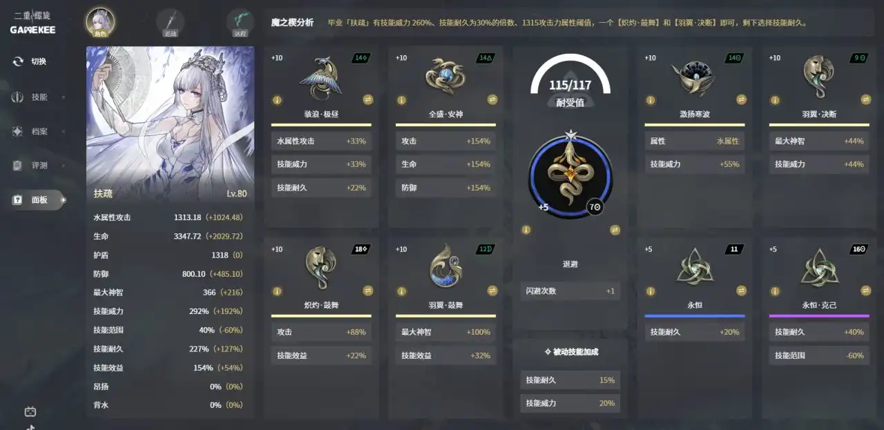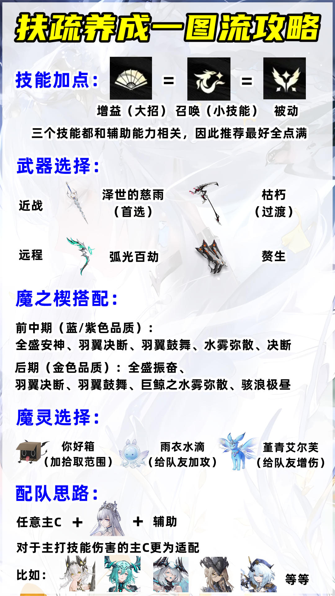 角色特点:可以给队友提供回血、回复神智、护盾、技能威力、技能速度提高等多种增益的T0级别万金油辅助技能加点顺序:增益(大招)=召唤(小技能)=被动以上三个技能都和扶疏的辅助能力相关,因此推荐最好全点满武器选择:扶疏给队友提供的技能威力提升,是根据自身的技能威力进行加成,推荐优先堆该属性近战武器推荐首选泽世的慈雨(加技能威力、给队友提升技能伤害)、过渡可以选择枯朽(加技能威力)远程武器可选