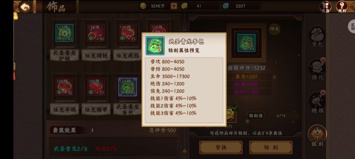 目前青龙饰品属于最高级!题外话普遍玩家才一两件大佬级却已满配(希望后续多送点嘿嘿平衡下):如图所示:青龙属性是可以继承的比较划算500元宝但是1个青龙魂1600-1800元宝(成本太高后续希望减少)。刻铭重铸100数值就——带过了(后续介绍)接下来青龙继承攻略如下1首先得看继承的属性是否满意2青龙刻铭属性条是否需要3继承500元宝是否划算4青龙魂刻铭是否得当5满值15大佬们可以去尝试6普遍玩家可以