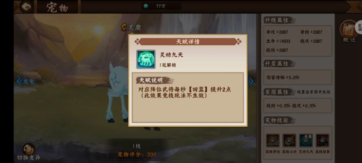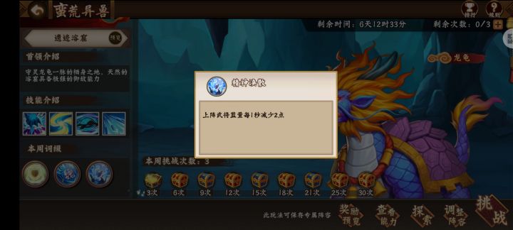 题外话:国贰游戏副本与宠物相对应的(互补)!如图所示:宠物天赋(一冠加蓝)副本蛮荒减蓝!攻略见解1宠物对应上阵(按照武将123所对应宠物123)才能想要的效果!2蛮荒异兽词语注意看(减少普或技—暴击.伤.大招怒气—等等)采取措施宠物几乎都涉及到可以用起来。3毕竟宠物一冠大部分玩家还未达到根据自身情况用相对合适的宠物哦打出认为良好的伤害哦⊙∀⊙!