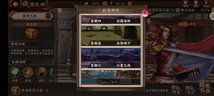 如图所示:国贰试炼分为七天周期并且说名守关bs。闲话:有点像奥特曼打怪兽哦当成功打倒怪兽无比的喜悦!本人认为吕布许褚比较好打(因为有好方法打后续)攻略:打吕布只有两图分别用聚怪(技能娃娃等)集火,图二相对磨人基本操作(建议配合能叫大佬带最好)。许褚有三图分别娃娃破高防铁甲兵吸在高压板能够快速解决,图二先躲其锋芒(往下或者暴气切将)然后集火,图三也是最主要的打猪(许褚)由于bd本身霸体大招利用好天师