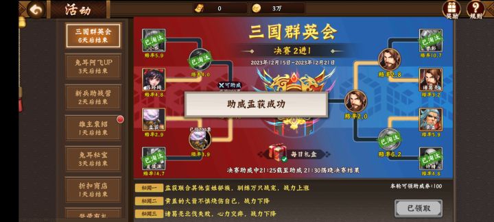 如图所示:闲话简述,这是一个怡情下注盛会就不过多介绍!攻略:根据自身情况总结。1想要全中称号的伙伴可以以次分两边5/5开压。2想保险率高收获的伙伴可以最后压一边。3想要看秘闻压一般两真一假。最后建议分别在时间段内领取助战票请注意看图,错过了就没了哦!