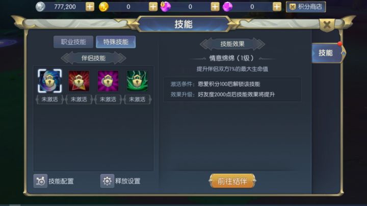 经常玩《守护者大陆》的宝子都知道,在角色技能中,职业技能分为主动技能和天赋技能。而在我们学习完这些常规技能之后,还有特殊技能。今天就跟随小编一起来看看特殊技能都有哪些?并且有哪些限制使用条件和技能效果呢? 首先,等级限制,只有等级达到25级的玩家才有资格开启我们的特殊技能。 情意绵绵(1级)技能效果:提升伴侣双方1%的最大生命值 激活条件:恩爱积分100后解锁该技能 效果升级:好友度2