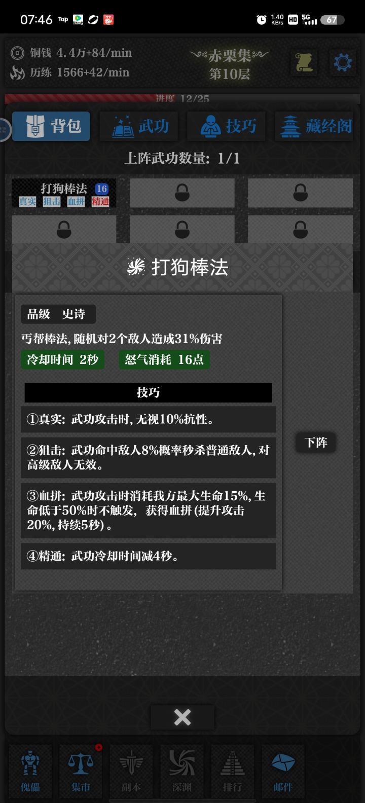 新人抽取功法一定要心中默念(遥望群主,法力无边。)本人深得遥望群主的青睐一次10连获取4技巧打狗棒法,感谢遥望群主厚爱