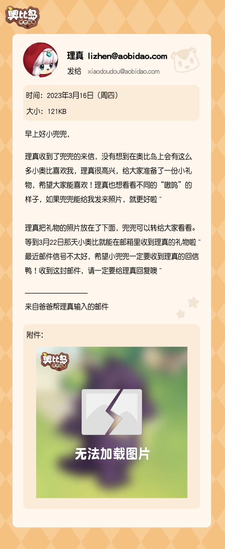 经常有奥比跟兜兜表达对理真的喜爱,兜兜已经通过邮件把大家对理真的夸赞都告诉了她,今早终于收到理真的回邮了!理真很高兴可以受到奥比们的喜爱,于是打算给大家每人送一份小礼物,但是兜兜在查看礼物照片的时候却总是加载失败。听弗里奇说这可能跟黑古拉最近施展的神秘法术有关,这种法术会阻断大部分通讯信号!据说如果能有更多人同时查看照片,就能帮助破解法术,恢复照片原貌。⭐活动时间⭐3月16日-3月21日23: