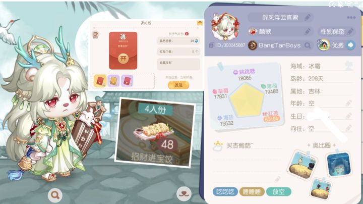 互发红包互吃晶钻饺子本人有:1.晶钻红包30个,每个红包28个晶钻,五人份,拼手气。互发方式:开茶话会,在茶话会里发。缺4人2.晶钻饺子(招财进宝饺子)48个,4人份,每份2个晶钻互吃方式:两个人相互分享,你吃我的,我吃你的。人数不限,只要有晶钻饺子就都可以来互吃。另找人互相做派对活动:每周一次,刷人气值到1500。(不会的可以找我,我教你)也可互做亲密任务,互吃钻饭,互浇水除虫