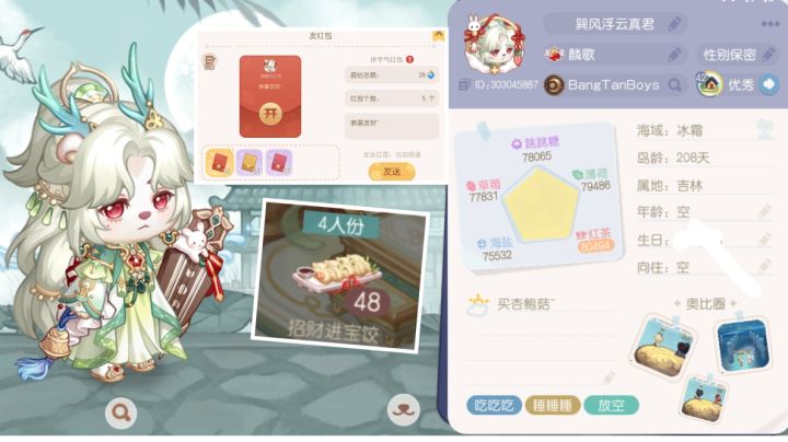 找小熊互吃饺子互发红包本人有:招财进宝饺子48个,每个饺子能吃四次,一次两个晶钻。晶钻红包30个,每个红包有28个晶钻,能有五个人领,拼手气。有意向的小熊可以加Q3307319020或V:JHL-1709