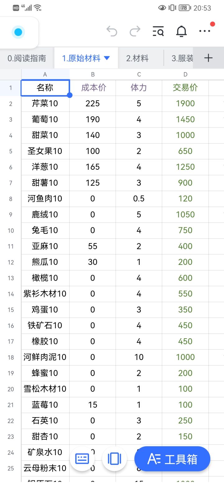 【奥比岛商品信息表】https://d2qzwuwz3i.feishu.cn/sheets/shtcn2EJ0Wa4jWNNsrtIP8VOB47做了一个商品信息表,包含了商品的成本、体力、交易价、利润体力比、推荐交易商品等等(゚ε゚○)这是一个共享文档,你们以随时查看,我这边更新了也会马上显示到你们那边,可以保存网页也可以下载app(顺便安利这个文档用来记账也很好用!展示了部分表格信息,完整的点链接直接看!