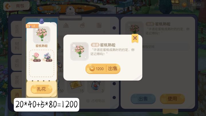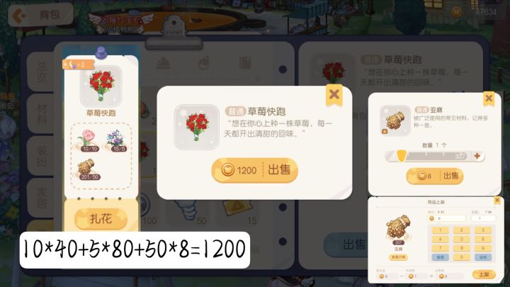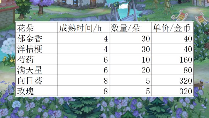 今天发现可以卖花白嫖金币,有友友问扎花再卖会不会提高价格,就算了一下。采花地点是奥比斯山脚,不消耗体力,图一是花朵的成熟时间、产量以及单价。橘子泡泡和蜜桃熟啦这两种花束都是只需要花朵合成,花束价格和原材料价格相等。后面需要其他材料的花束只测试了草莓快跑,亚麻的价格按照背包出售价格计算,花束价格和原材料价格之和相等,但是亚麻拿到交易所去卖要比在背包卖贵,所以扎成花束之后亏损了一部分亚麻的钱钱。按照目前的结果来看,是直接卖花朵就好啦,不需要扎花。