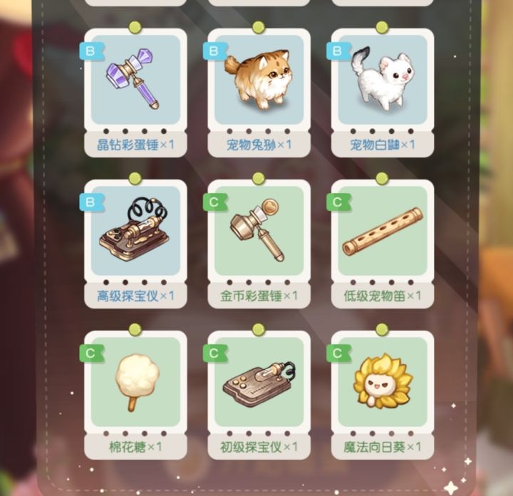 手游预约奖励各位应该都收集挺多了,但是也有小伙伴还不知道一些奖励的具体用处是什么,在只能带八个物品的前提下纠结如何挑选。建议: 优先考虑服装、晶钻彩蛋锤、高级探宝仪器,晶钻锤和高级探宝仪可以尽量多带。奖励多的情况下c级奖励可以不用带。(如果有s级或以上的奖励当然必选啦)用处讲解1.晶钻彩蛋锤和金币彩蛋锤是手游的抽奖道具。单次晶钻抽奖消耗50晶钻或者一个晶钻锤。单次金币抽奖消耗2w金币或者一