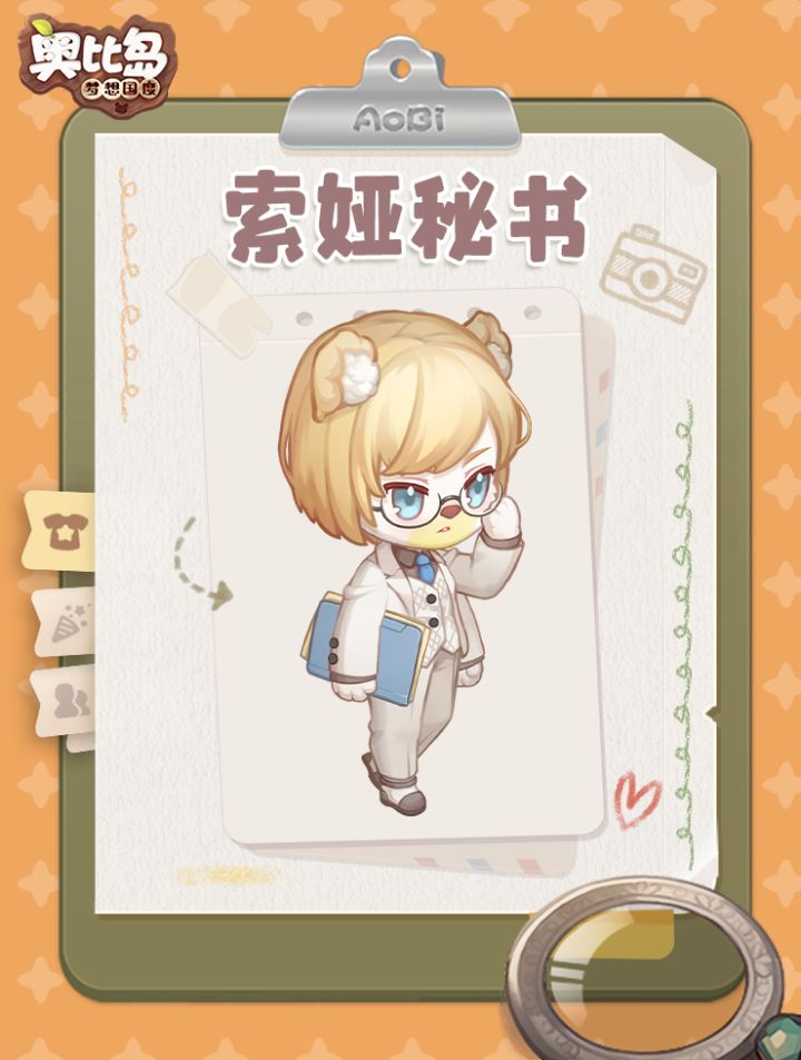✿身份决策部秘书。✿所在之处奥比岛奥比广场。✿基本信息25岁。生日在10月9号,天秤座。✿性格冷淡、干练,公事公办、注重效率。但私下里是个喜欢可爱的小东西女生。对薇丽塔的热情无法招架。✿索娅秘书的故事少年时期:索娅秘书是学习非常认真的学霸,以优异的成绩从学校毕业。在校期间,她就已经明确了人生目标——在政界发光发热,让奥比们过上快乐的生活。青年时期:从学校毕业后,加入了岛务厅,进
