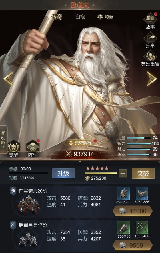 【传记】亚瑟王持有一把石中断剑,那把剑能秒断很多武器,至于石中剑的故事,你可以问问吟游诗人比尔。【英雄简介】初始属性:力量:96 智力:86 魅力:92 统率:90亚瑟能打能抗,是平民也可以养的起的一个英雄。亚瑟作为洛基克星,对上洛基这类文官真的一点都不虚,尤其是可以越级打的实力,但还是有弱点的,基础天赋也决定他并不是前期英雄,前期玩起来会稍显吃力,因为前期兵种属性不高,撑不过几回合,故亚