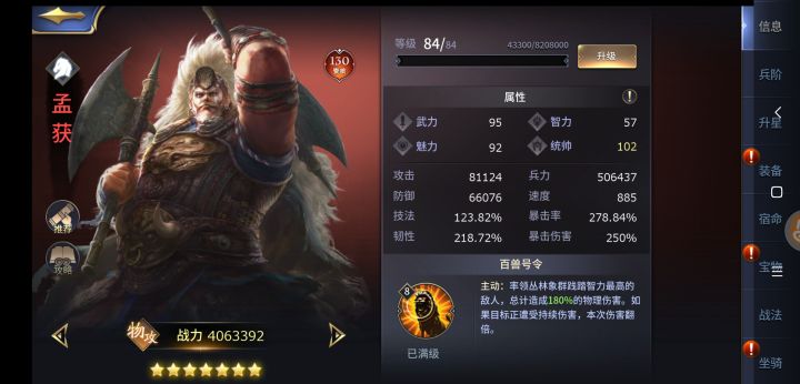 孟获,三国时期南中地区少数民族的首领,公元225年起兵反叛蜀汉,被诸葛亮率领大军七擒七纵后降服,此后不再叛乱,名流千古。。。。。孟获是一位130资质的物理输出英雄,都说是用来针对目前十分强势的刘备的,那么具体实战如何呢?首先让我们看一下孟获的属性图:从上图来看孟获四维武力95魅力92统帅较高有102但是智力只有57和紫将差不多比他老婆还低,这么低的智力实在对不起他130资质英雄的身份,在同等