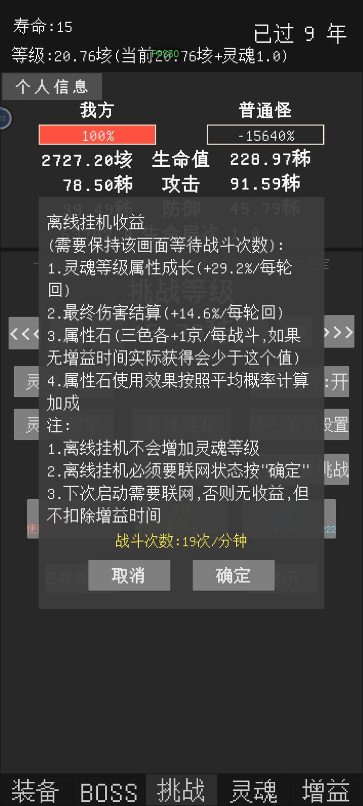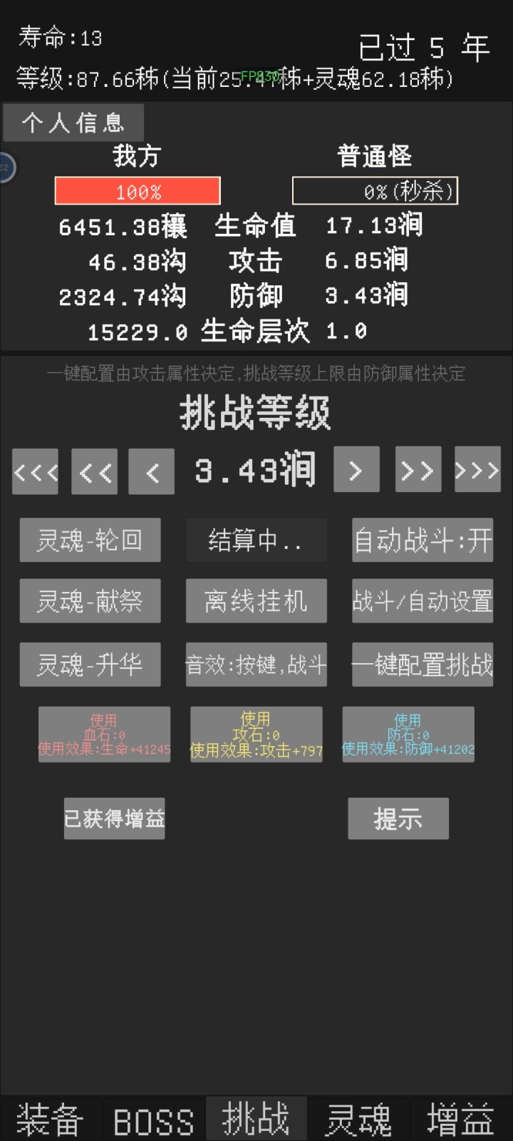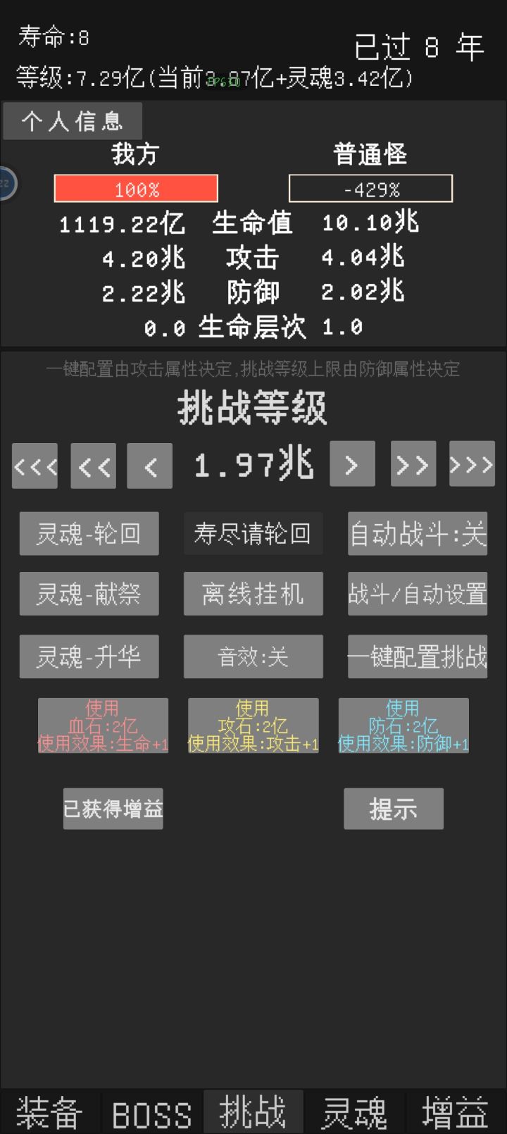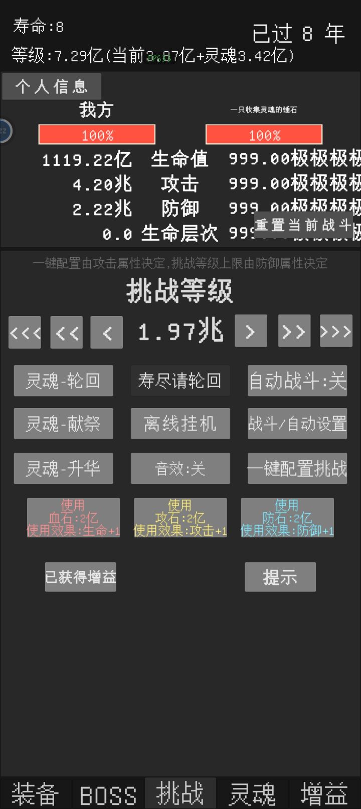 反馈一个小bug,在自动战斗关闭,自动轮回关闭的情况下,寿命到头时可以通过打锤石然后按重置来回一年寿命,所有除了寿命以外的数值都和原本一样,可继续挑战一年。目前看来,重置后依然可触发重置,有个别时候可一次性重置两年。其中有次重置多了后正常的打怪也可以触发类似效果(当时没截图)不过之后就没出现过了(主要是没那么闲了)