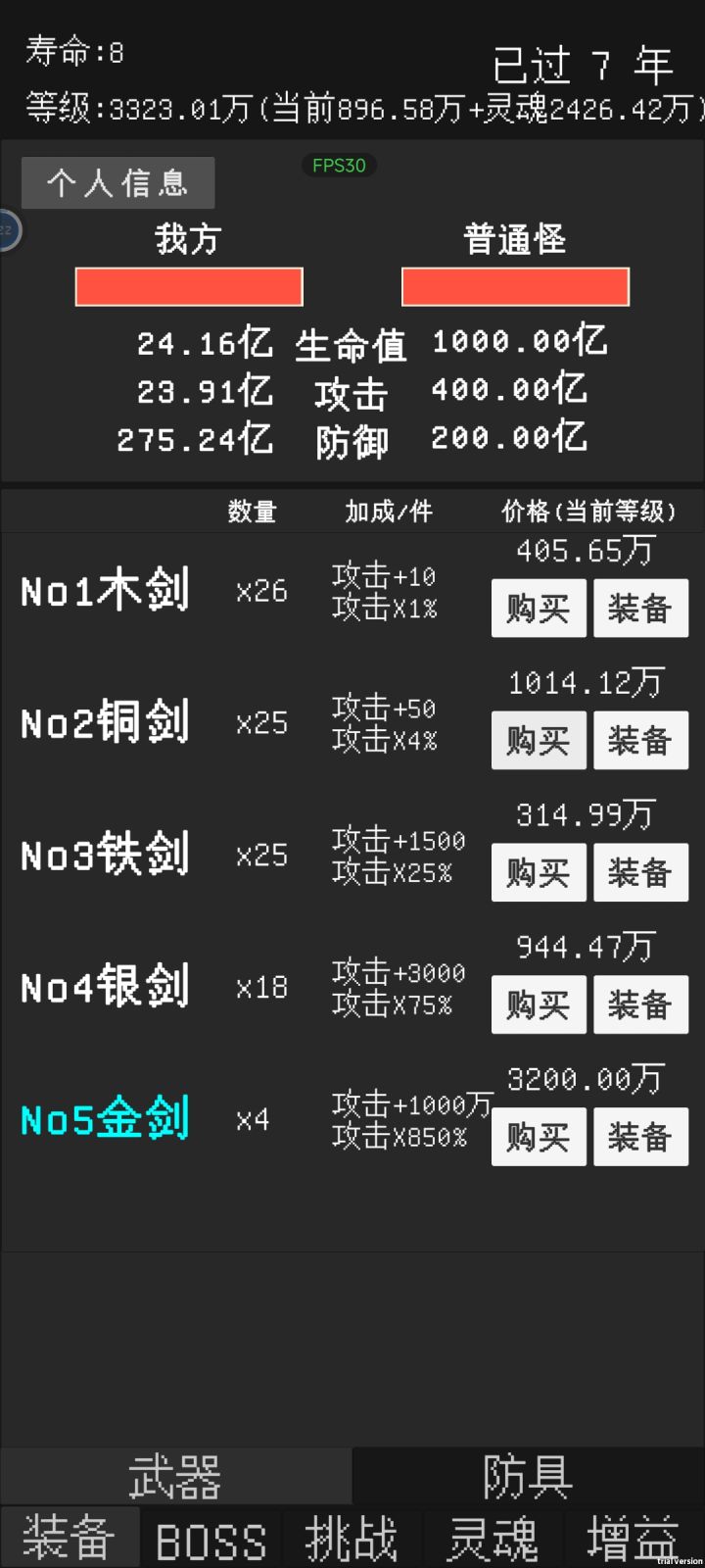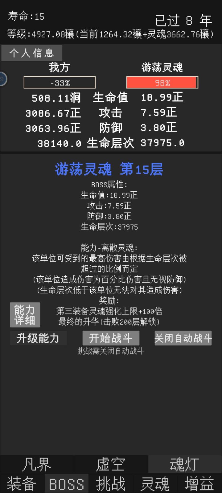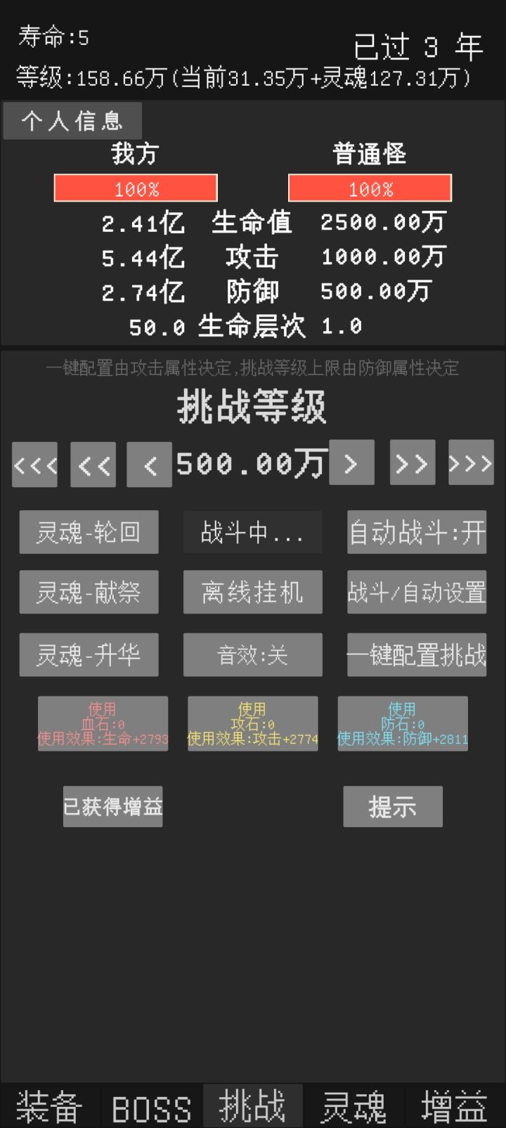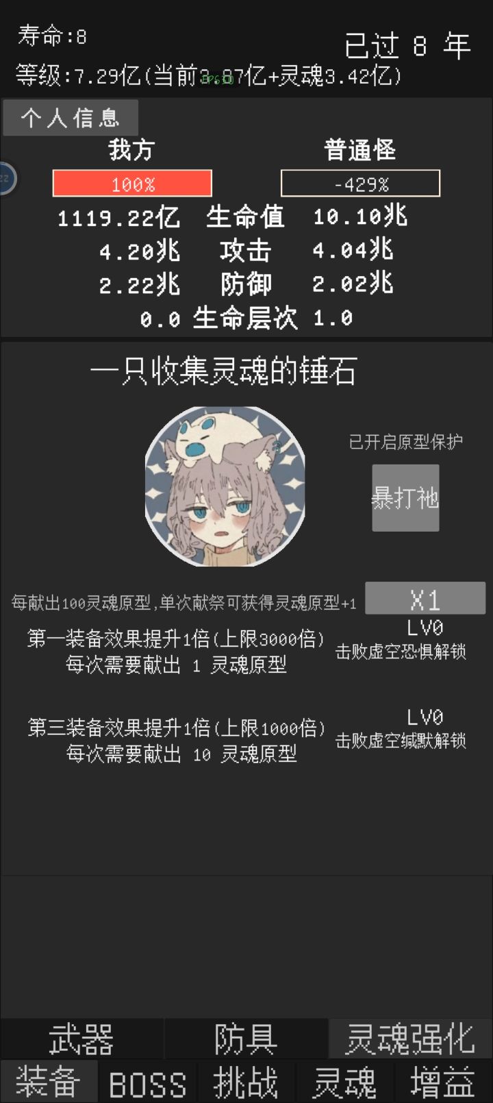 反馈一个小bug,在自动战斗关闭,自动轮回关闭的情况下,寿命到头时可以通过打锤石然后按重置来回一年寿命,所有除了寿命以外的数值都和原本一样,可继续挑战一年。目前看来,重置后依然可触发重置,有个别时候可一次性重置两年。其中有次重置多了后正常的打怪也可以触发类似效果(当时没截图)不过之后就没出现过了(主要是没那么闲了)