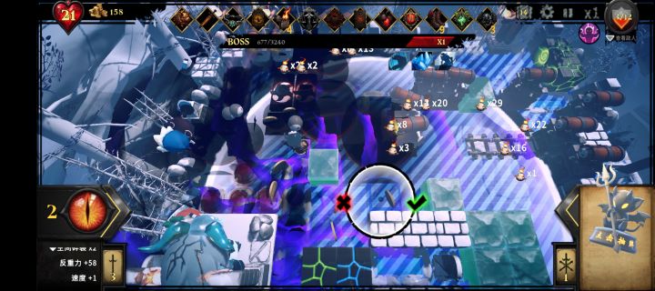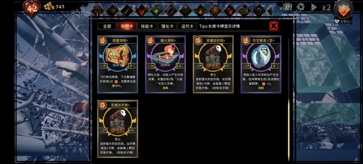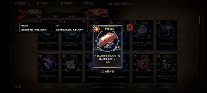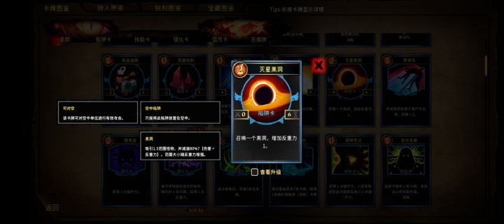 #陷阱大师攻略 从难度一开始,初始卡组送的反弹机关就是我手上最好用的秒杀帮手。在难度逐渐提升的过程中,我存够了眼球,试探性的在提升中解锁了一份新的卡片。(这边不得不吐槽买之前你都不知道自己买的卡是什么效果,图鉴也不显示)我最早遇到黑洞的这个反重力词条还是在召唤物冰剑士身上,当时没注意,后来用了黑洞才发现真是拖人下水的利器。黑洞本身是没有伤害的群体拖拽,每打出一张提供一点反重力,降低全场敌人10