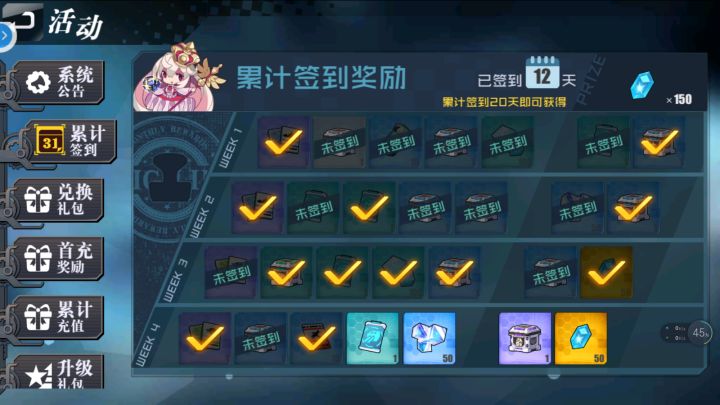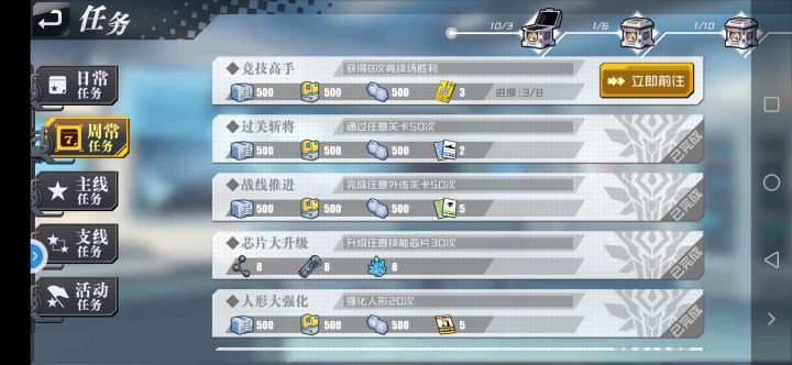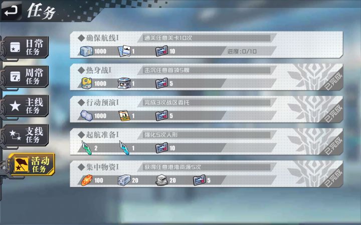 1.日常、周常任务已经在更新前完成十项+,但宝箱奖励没有跟进,如图2.支线任务无次数进度【以上两项不知道在更新完后的一堆邮件中是否补偿过?】因为已经领取的无法查阅,领取时没注意3.打2-6后,自律提示登陆战绩,也没考虑就选择了(用的一队,高战高消耗),而想自律时却不能用低于这个战力的,实测三队也能顺利通关,但并不更新低成本自律条件…只有用时最短才会提示登陆么?
