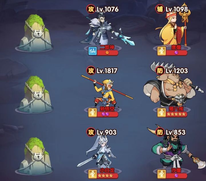 为了让玉帝大大们更熟悉我们的大圣顶住,猪猪这就找到了适合大大们开荒了的第一攻略,结合其他大神的攻略加上自己摸索的些小细节写给大家!满满的干活哦!一:开局阵容推荐孙悟空必备,这个不用多说,6R首冲0氪靠运气抽到孙悟空就玩,主打一个白嫖。二:阵容推荐: 取经5人组(猪八戒沙僧小白龙) + 二郎神不管是氪金大佬也好还是白嫖玩,家这套阵容可以说是前期战力天花板,羁绊拉满,推图快,爬塔强三:人