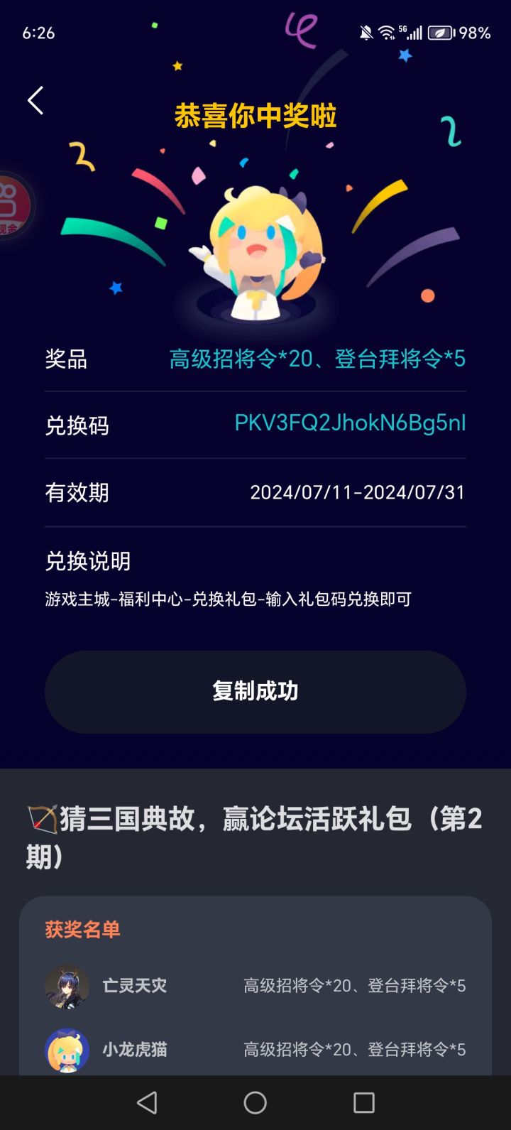 本次活动获奖名单如下:请获奖的主公于2月27日前,前往问卷填写领奖相关信息,工作人员核实后将尽快安排发奖~■领奖信息填写地址:请注意:逾期未填写导致奖励无法发放,则视为自动放弃奖励,不予补发。龙年行大运,祥瑞照门庭。新春将至,我们在此预祝主公们龙行龘龘,前程朤朤!本次活动欢迎各位主公在评论区写下您的新年祝福,只要留下祝福语即可参与购物卡抽奖!【新春送祝福节日活动】✦参与方式✦活动时