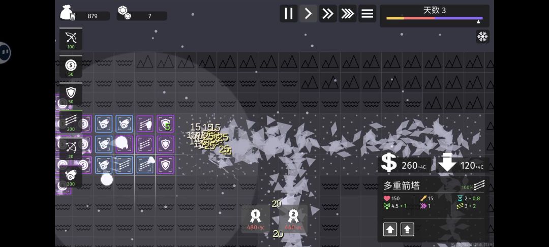 箭塔、多重箭塔、激光塔、围墙、加热塔、金矿、冰冻金矿、水晶金矿,按图中摆,开局先造两个冰冻金矿,然后升一下日光塔到二级,然后把刚造的金矿也升一下,有金币了继续造金矿,等金矿到4个,把一个箭塔放在先出怪的那边,剩下就慢慢摆先造两边,再造上下,上下可以时间到第二天造,普通箭塔选快速射击,多重选广角射击,激光塔选第一个,围墙可以升紫,也可以不升,升了容易水晶少,第三天之前金矿全部都可以是蓝的,第三天就应