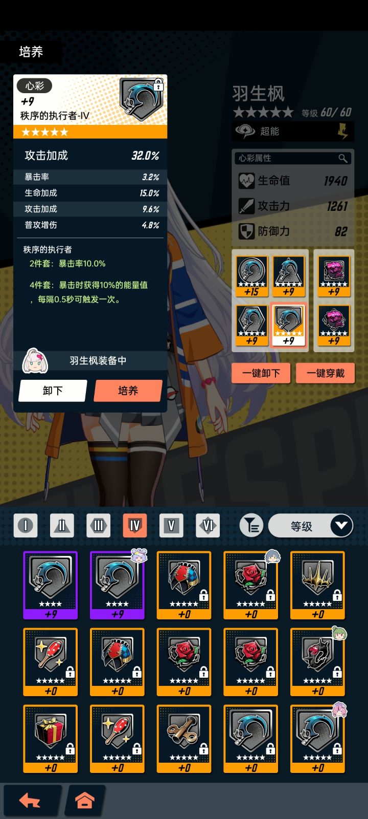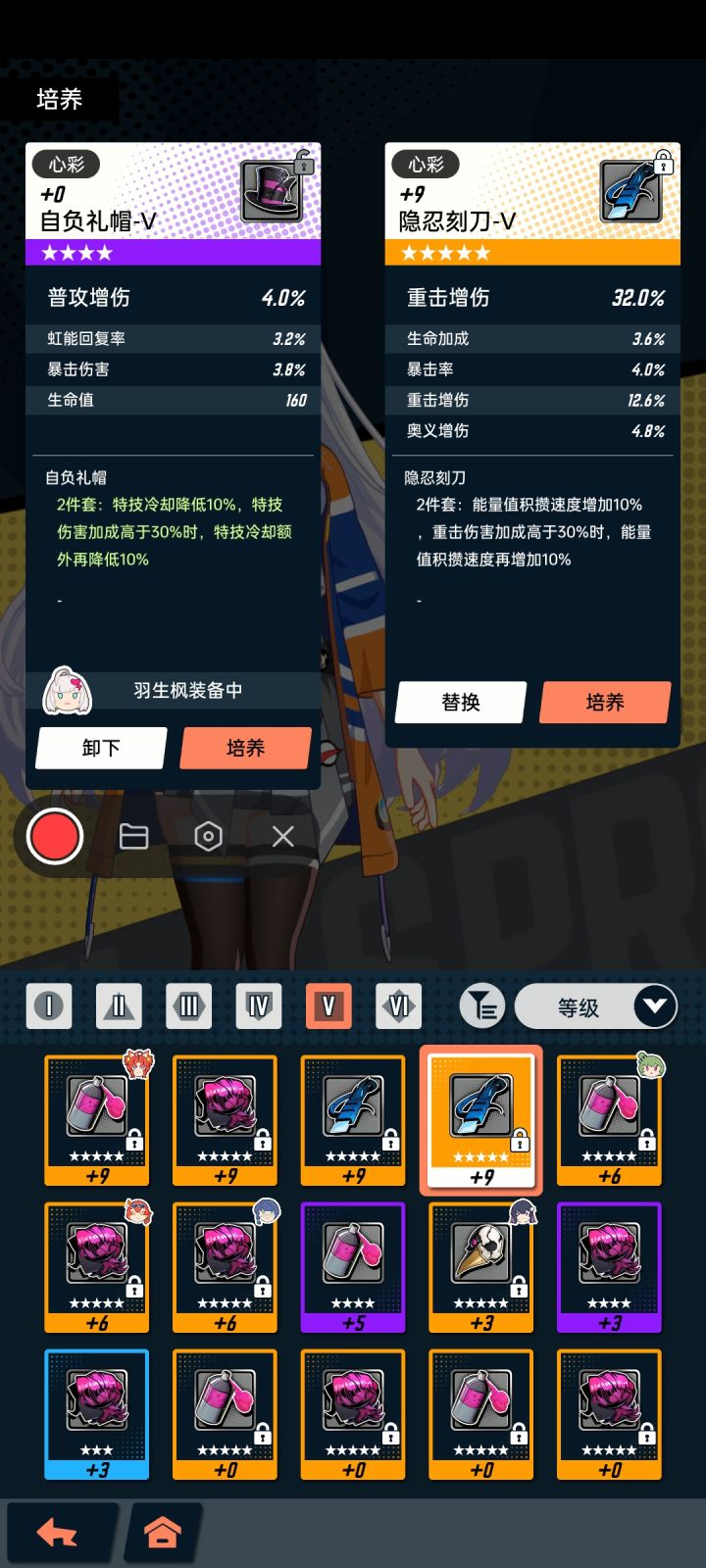先贴个进度证明玩法可行枫有两种玩法,一种是官方主推的重击,另一种则是因为枫高额的奥义倍率和切人可以保留虹能的机制衍生的速切,这里只讲速切,速切上限虽然不如重击,但也有前期成型快和街头凹分的优势心彩套装选择4发条或者2齿轮2执行者,5号位和6号位的两级套选择秀发,秀发两件套的效果对枫的伤害提升不是很大,这里选择刷秀发是为了给辅助顺带刷以及后期街头的主宰战开局提供虹能秒boss,追求极限伤害的可以