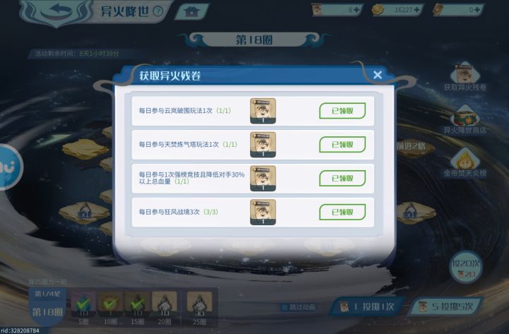 被战力碾压没意见,但特么不是卡,就是有挂。竞技场的破问题,全带过来了。三次狂风战境,是异火的日常任务。一天不落的做任务,才勉强拿到手。想不打,直接第二天找回都不行。巅峰共斗现在主要打英雄模式,普通的一般都是找回奖励,虽然差一点。斗者试炼,主要打碎片,做一次日常任务,然后普通的想打就打,不想打就丢一边不打了。
