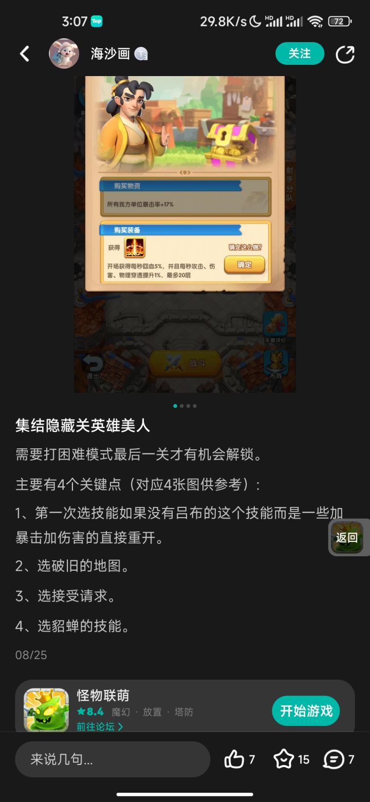3星打法,吕布貂蝉,高输出高爆发,最后boss1分钟通过。围绕两位搭配英雄,吕布和花木兰早点3星基本能清空小怪战士:吕布、花木兰、阿努比斯、春华法师:貂蝉、卡尔、海王、喜羊羊再来个鲁班英雄美人隐藏结局每次跳出buff必须要按顺序选才能出--吕布貂蝉的buff具体看图