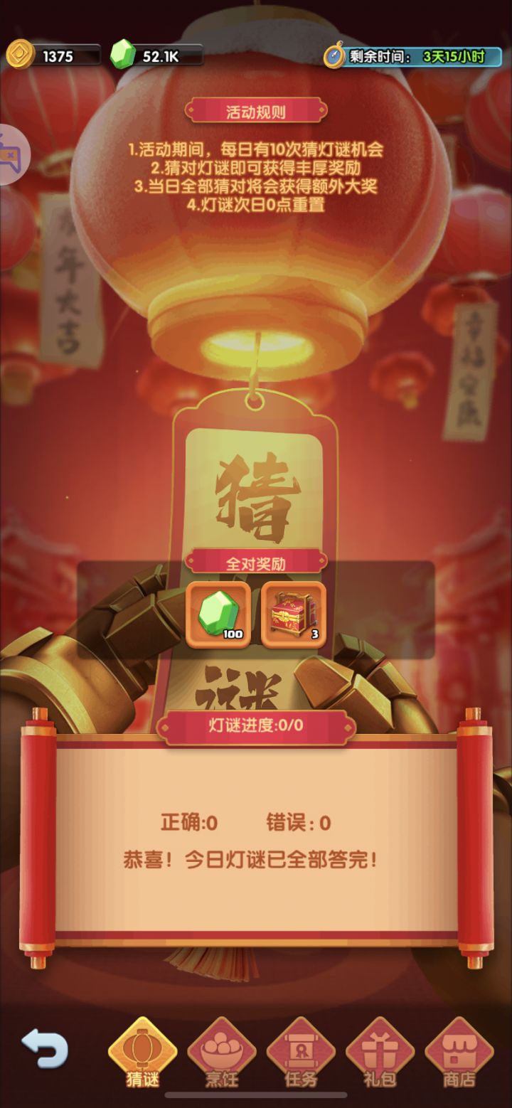 元宵节猜灯谜活动出问题了。一进去就显示今日灯谜全完成。不让猜了。@游戏懂哥