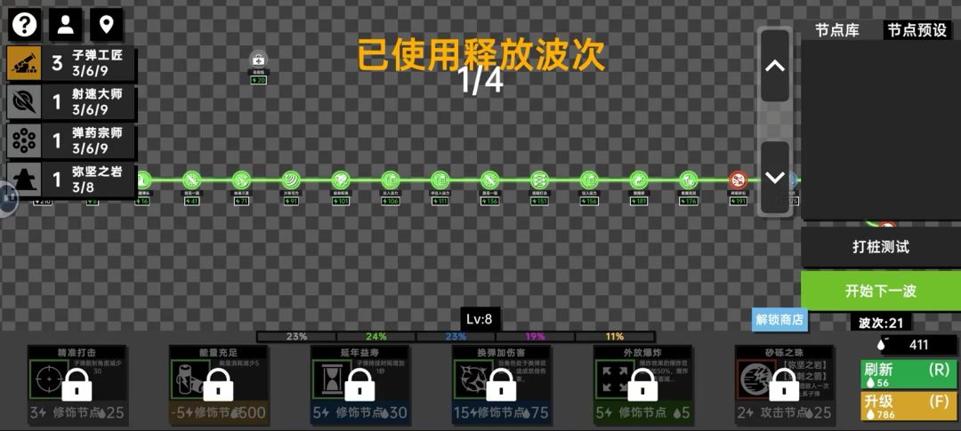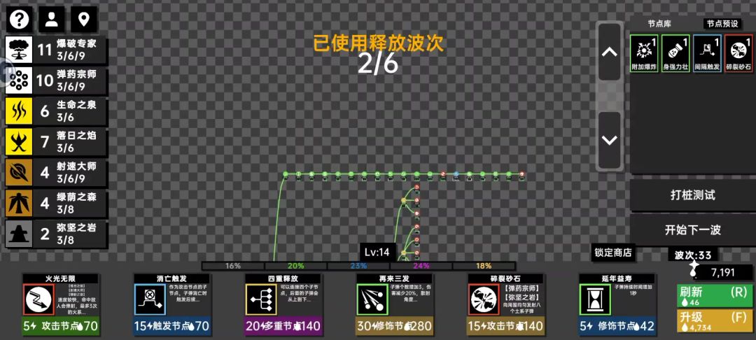 如题,有条线直接到一百万,,虽然我是新手,但是也想分享一下。 只需要只需要前期随便选一个(最好是爆炸的火球和水球),然后等到刷出昙花一现和那个力量的时候,就无敌了。 注意,蓝色节点放在后面,最好是用那个风雷成八个岩石的,配合一堆生成加能量、消亡加能量的用,这样保障你能量用不完。 注意,能量上限也要技及时升,,这样保你上100w #深渊看守者 #深渊看守者深渊看守者