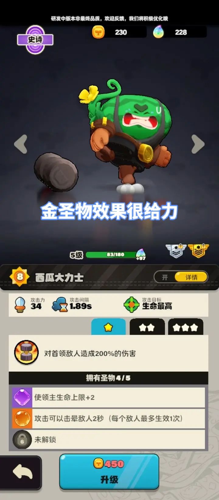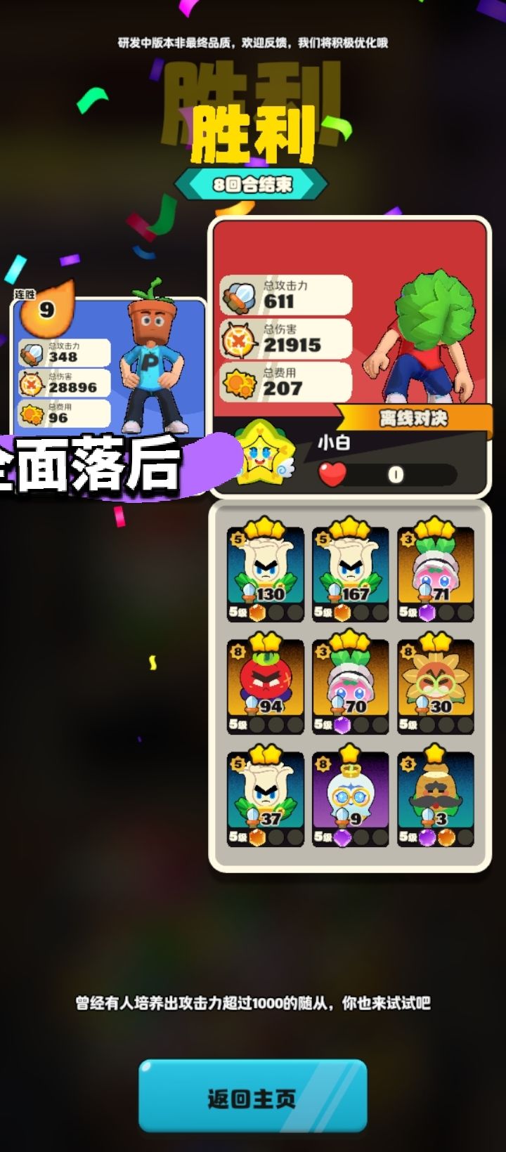 1000杯上下的黄金铂金局,一共3,4把这种大劣局落后差不多一倍数值,说下赢得心得1.必须养石榴,清小怪回合很强2.西瓜金圣物可以晕boss很关键3.7级玉米可以单体减速由于现在都是90多血的主角,9回合的boss几乎都打不掉,拖到9回合靠boss就能一口咬死对面,不过感觉练度高了这个套路就不行了