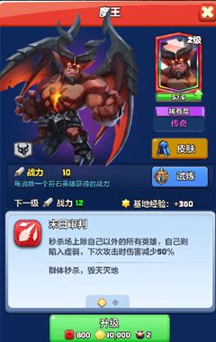 亲爱的召唤师们大家好呀!又到了我们的英雄档案时间了,这次给大家带来的是11段王者解锁的魔王,接下来看看他会给我们带来怎样的表现吧。 【英雄介绍】红色阵容的魔王,他是来自深渊地狱的魔鬼,可以召唤地狱火焰造成末日审判,可消灭一切生灵,尤其憎恨六翼天使,毕竟天使与恶魔从根源上就是不对付。一双宽大的翅膀为其增添了无尽的压迫感。传奇品质的魔王,初始等级为1,基础战力为6,每提升1等级,提升的战力为2