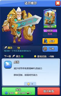 亲爱的召唤师们大家好呀!又到了我们的英雄档案时间了,这次给大家带来的英雄是10段宗师解锁的达尔维尔,接下来看看他会给我们带来怎样的表现吧。 【英雄介绍】蓝色阵容的达尔维尔,他是联盟中最谨慎的统帅,最辉煌的战绩是在魔王入侵时,坚守据点,扭转战局。他攻守兼备,一旦发起冲锋将威慑敌人,对所有敌人进行削弱。传奇品质的达尔维尔,初始等级为1,基础战力为6,每提升1等级,提升的战力为2。达尔维尔的升级