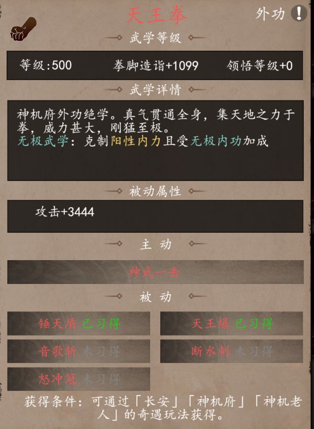 天王拳 材料 获取攻略必要条件: 容貌60+ 悟性80+何首乌 * 6 (扬州--东南林地2)黑豆 * 5 (兴庆--兴庆互市) PS:夜晚晴天出没川牛膝 * 6 (成都--成都南郊)山茱萸 * 4 (洛阳--奉金药铺) PS:容貌60柏子仁 * 4 (长安--城隍庙) PS:福源60知母 * 4 (济南--胡同) PS:夜晚晴天出没黄柏 * 4 (襄阳—碎石路)当归 * 4