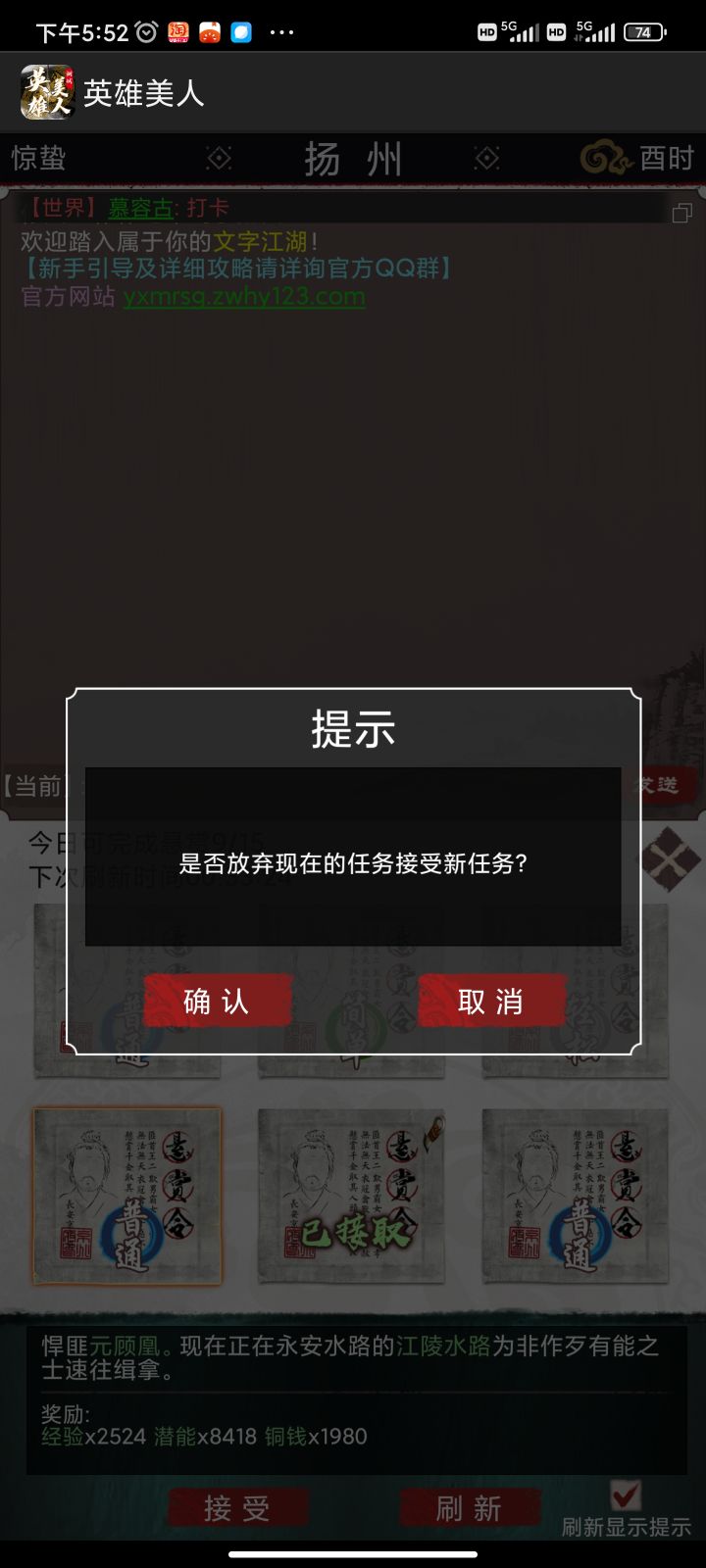 一次只能接一个任务,完成还要回扬州有点浪费时间,希望可以同时接多个任务。取消任务就以重新点击已接任务来取消。(若是已被刷新,等一天,以现实一天已过取消掉)