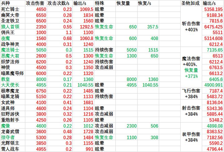 绿色表示带生命恢复效果(不全代表数据为恢复量)教皇,大天使长,魔像,魔法骑士吃圣物恢复加成夜魔,狼人首领,恶魔大君,掠夺者不吃圣物加成此帖失去实效性,且年久失修有问题欢迎直接留言