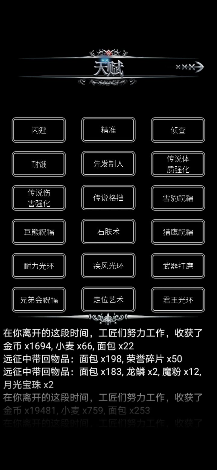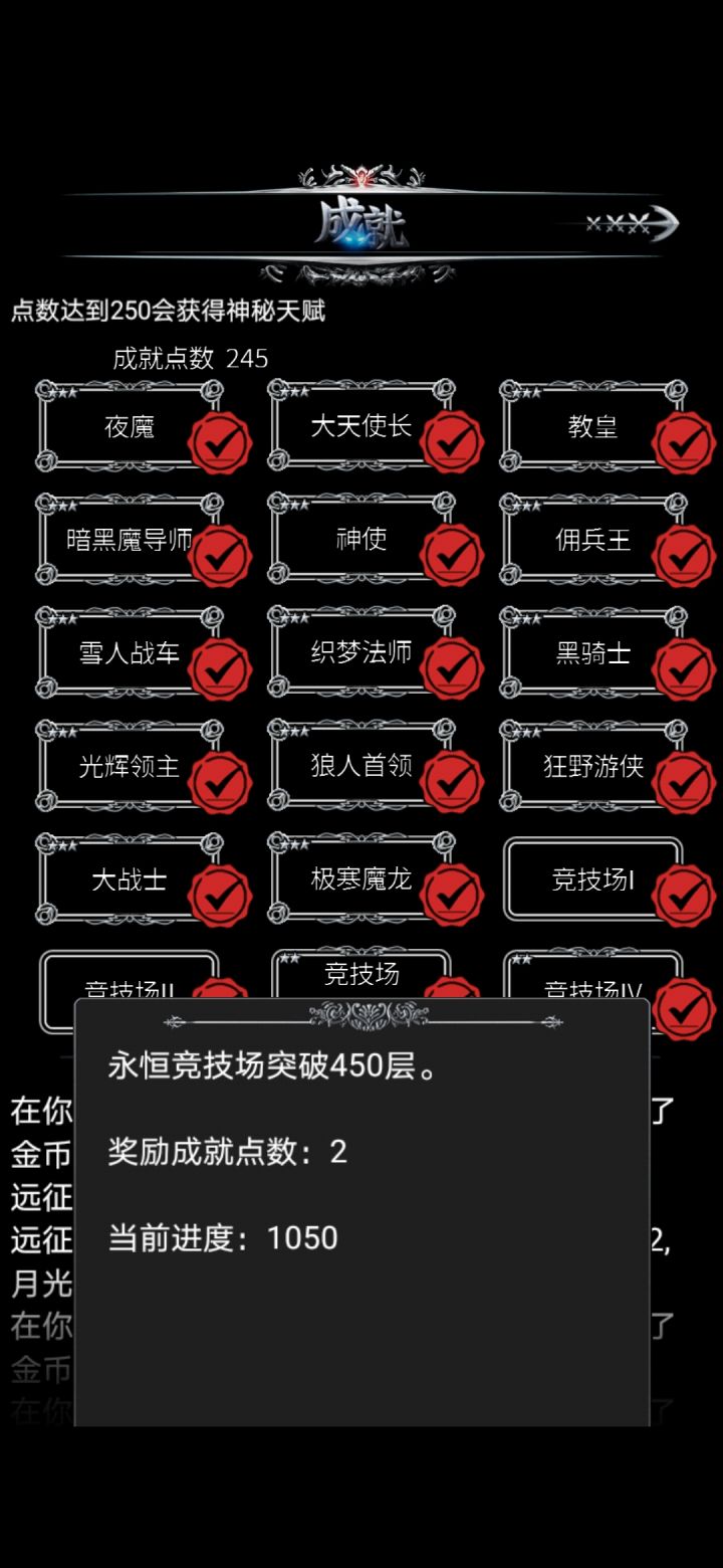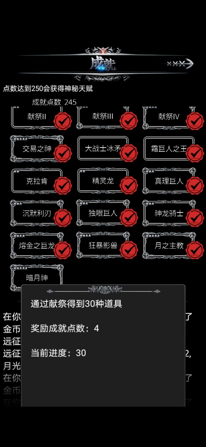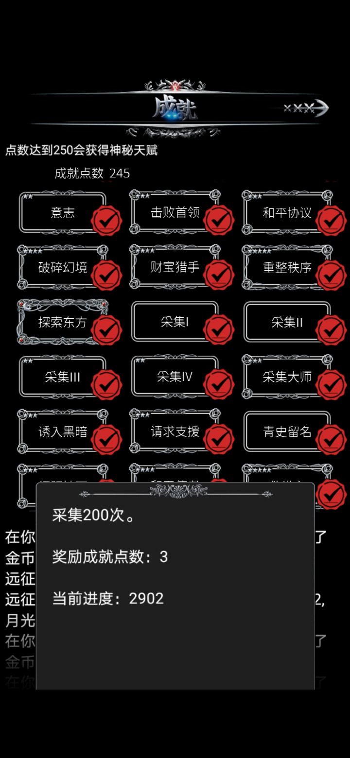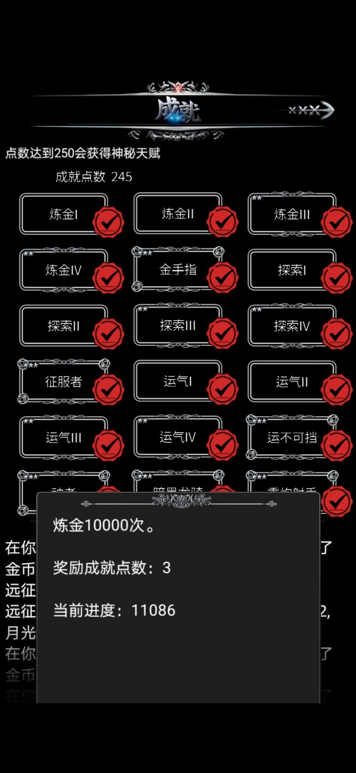 本帖顺序按游戏内成就的顺序,仅简单说明成就的获取方法,具体怎么操作还得看玩家自己炼金1-4,金手指这个没什么好说的,下载一个连点器挂机就可以了[毕竟手点一万次是需要毅力的😂]探索1-4,征服者探索度通过打地图中的据点获得,一个据点一个探索度。征服者的要求是探索度到500,游戏bug,它显示的是“死亡”简单的说推图就行了运气1-4,运不可挡赌博胜利10/20/30/40/50次。在主城